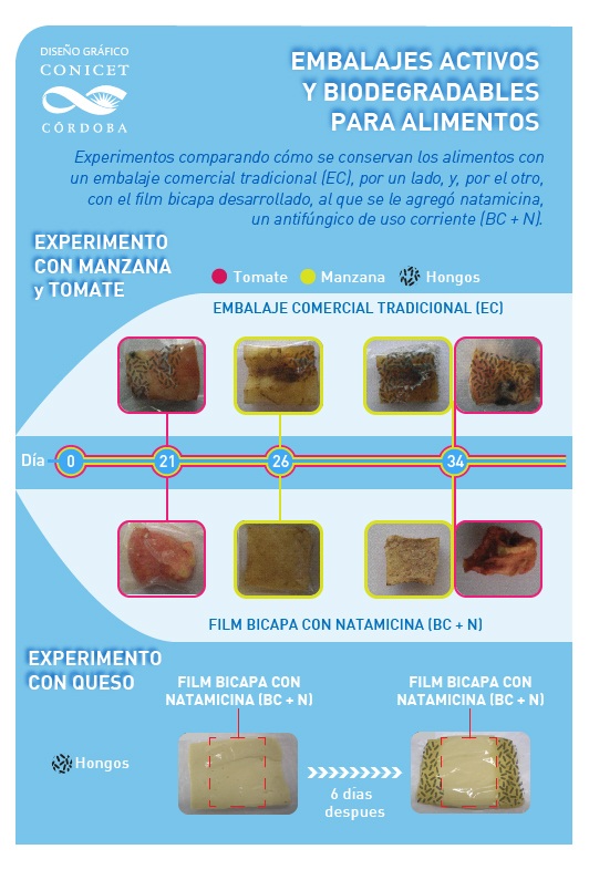 Con el envase BC + N, la formación de mohos se retrasó trece días en tomates y ocho en manzanas respecto al EC. Por otra parte, un trozo de queso fresco sin envoltorio mostró deterioro al sexto día de almacenado, mientras que se conservó sin moho al recubrirlo con el film BC + N. Finalmente, mediante estudios de enterramiento, se demostró que en contacto con la tierra el film bicapa se biodegrada y desaparece en cuestión de semanas.